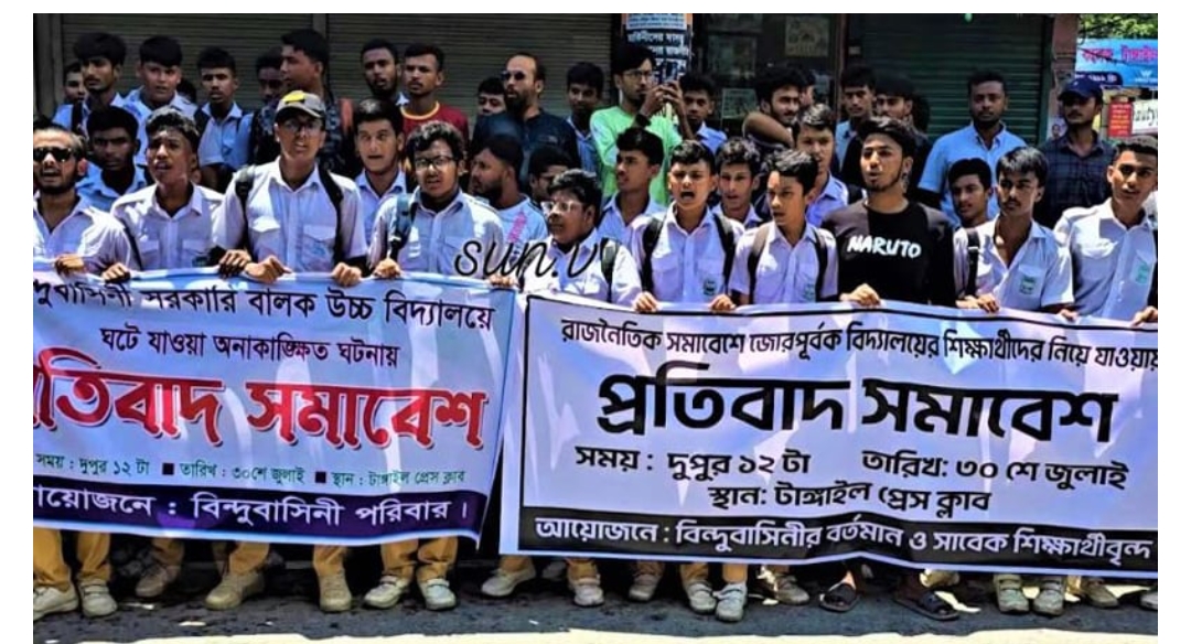 টাঙ্গাইলে জাতীয় নাগরিক পার্টির (এনসিপি) পদযাত্রায় শিক্ষাপ্রতিষ্ঠান থেকে শিক্ষার্থীদের যেতে বাধ্য করার প্রতিবাদে বিক্ষোভ ও মানববন্ধন কর্মসূচি পালন করা হয়েছে। আজ বুধবার দুপুর সাড়ে ১২টার দিকে বিন্দুবাসিনী সরকারি বালক উচ্চ বিদ্যালয়ের সাবেক ও বর্তমান শিক্ষার্থীরা বিক্ষোভ মিছিল নিয়ে শহরের বিভিন্ন সড়ক প্রদক্ষিণ করেন। পরে তারা টাঙ্গাইল প্রেস ক্লাবের সামনে মানববন্ধন কর্মসূচি পালন করে। এ সময় তারা ‘শিক্ষা প্রতিষ্ঠানে রাজনীতি চলবে না, চলবে না, চলবে না’ বলে বিভিন্ন স্লোগান দেন।