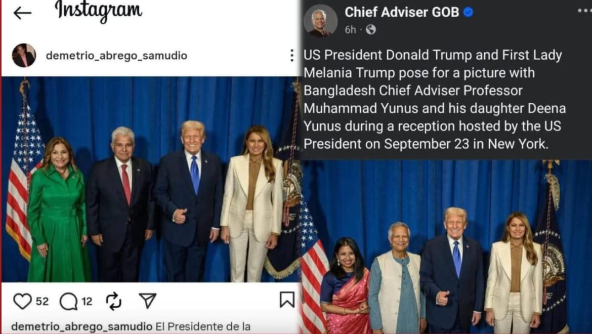 ছবিটি প্রথম পোস্ট করা হয় ভেরিফায়েড ফেসবুক পেজ “Chief Adviser GOB” থেকে। পোস্টে লেখা হয়েছিল, “US President Donald Trump and First Lady Melania Trump pose for a picture with Bangladesh Chief Adviser Professor Muhammad Yunus and his daughter Deena Yunus during a reception hosted by the US President on September 23 in New York.”
