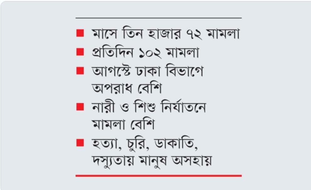 আগস্ট মাসের অপরাধ পরিস্থিতি বিশ্লেষণ করে দেখা গেছে, এ মাসে হত্যা মামলা হয়েছে ৩২১টি। ডাকাতি ও দস্যুতার মামলা হয়েছে ২৩৮টি। সবচেয়ে বেশি নারী ও শিশু নির্যাতনের ঘটনায় মামলা হয়েছে এক হাজার ৯০৪টি। অপহরণের ঘটনায় ৯০টি, পুলিশ হামলায় ৫১টি ও চুরির ঘটনায় মামলা হয়েছে ৯৫৬টি। এর মধ্যে সবচেয়ে বেশি ঢাকা মহানগর এলাকার বিভিন্ন থানায় ৩২টি হত্যা, দস্যুতা ও ডাকাতির ঘটনায় ৫৪টি, নারী ও শিশু নির্যাতনের ১৫৯টি, অপহরণের ঘটনায় ১৬টি ও চুরির ঘটনায় ১৩২টি মামলা হয়েছে। চট্টগ্রাম মহানগর এলাকায় ডাকাতি-দস্যুতার অভিযোগে ১১টি, হত্যা তিনটি, নারী ও শিশু বিষয়ক ৪৯টি, অপহরণের অভিযোগে ছয়টি ও চুরির ঘটনায় ২৫টি মামলা হয়েছে।