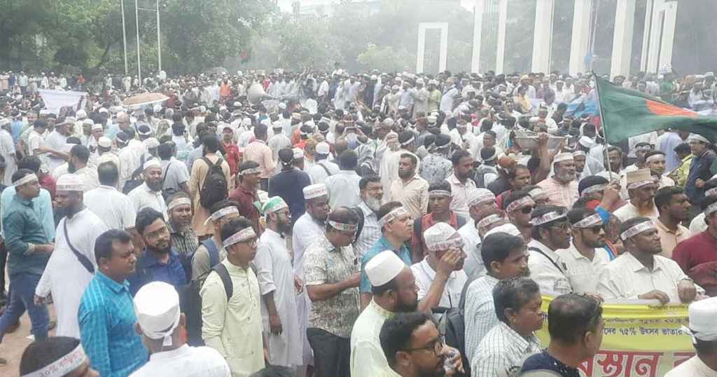ঢাকার কেন্দ্রীয় শহীদ মিনারে বাড়িভাড়া ও চিকিৎসা ভাতা বৃদ্ধিসহ শিক্ষা জাতীয়করণের দাবিতে আন্দোলনরত এমপিওভুক্ত শিক্ষকরা অবস্থান নিচ্ছে। হাতে জাতীয় পতাকা ও বিভিন্ন দাবিদাওয়া লেখা প্ল্যাকার্ড নিয়ে কানায় কানায় পূর্ণ শহীদ মিনার প্রাঙ্গণ।