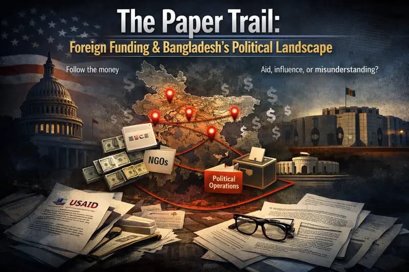 যখন আন্তর্জাতিক মিডিয়া ২০২৪ সালের আগস্টের “গণতান্ত্রিক অভ্যুত্থান”-এর জন্য স্তুতিগান রচনায় ব্যস্ত ছিল, তখন অনেকটা নীরবে গ্রান্ট ডাটাবেস, কংগ্রেসের সাক্ষ্য এবং ডিক্লাসিফাইড প্রোগ্রাম রিভিউতে আরেকটি গল্প জমা হচ্ছিল। এটি অর্থের গল্প, সেই অর্থ কোথায় গিয়েছে এবং তার কিছুকাল পরেই একটি দেশের নির্বাচিত সরকারের কী হয়েছে—সেই গল্প।